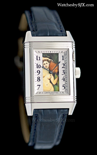 Diese besondere Reverso à Éclipses war Teil einer Serie von acht Uhren mit dem Titel Famous Nudes , die jeweils eine Reproduktion eines bekannten Gemäldes aus der klassischen europäischen Kunst, darunter Werke von Renoir, Klimt und Botticelli. Jedes Gemälde wurde sorgfältig unter Verwendung der Technik der Miniatur-Emaille-Malerei, eine Technik, die bei JLC von ihrem Meister perfektioniert wurde, Miklos Merczel. In den 2000er Jahren, bevor Metier d'Art modisch wurde, war JLC eine der wenigen Marken, die in der Lage waren, einen hauseigenen Enameller zu rühmen.